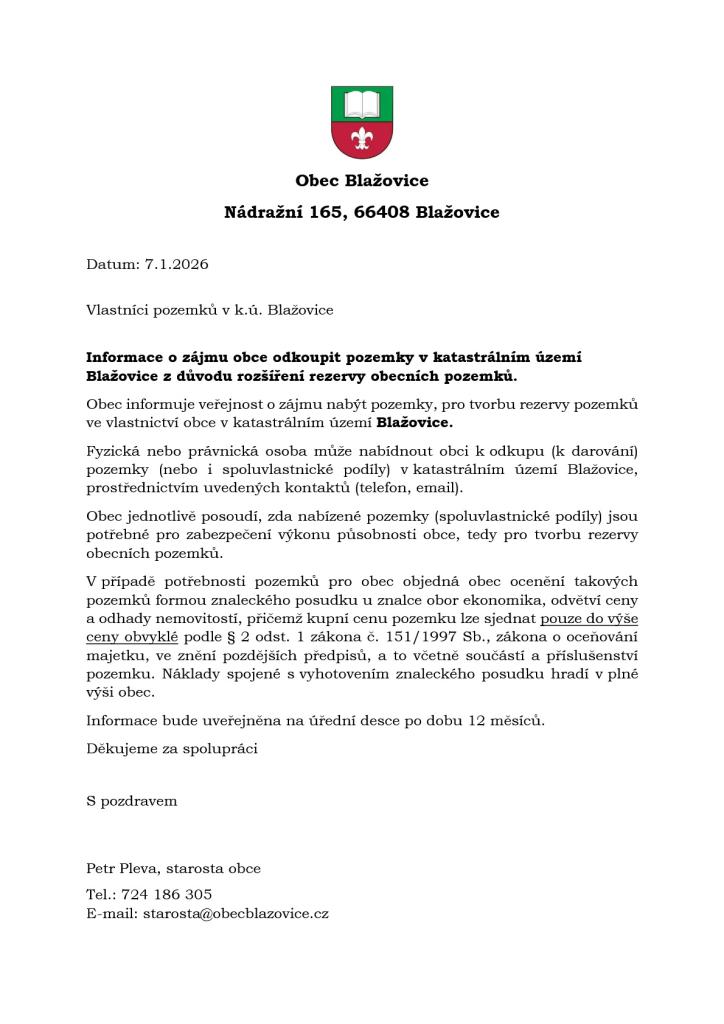 Obec informuje veřejnost o zájmu nabýt pozemky, pro tvorbu rezervy pozemků ve vlastnictví obce v katastrálním území Blažovice.