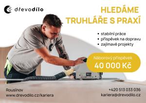Firma Dřevodílo Rousínov přijme pracovníka na pozici truhlář (s praxí). Nabízí stabilní zaměstnání, mzdu 40–60 tisíc Kč dle zkušeností, k tomu pravidelné odměny a bonusy. Nově nastupujícím truhlářům poskytuje také náborový příspěvek 40 000 Kč.