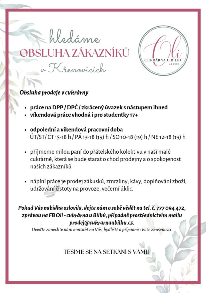 Cukrárna Křenovice přijme paní na odpolední a víkendovou obsluhu cukrárny. Práce na dohodu či zkrácený úvazek. Nástup ihned.