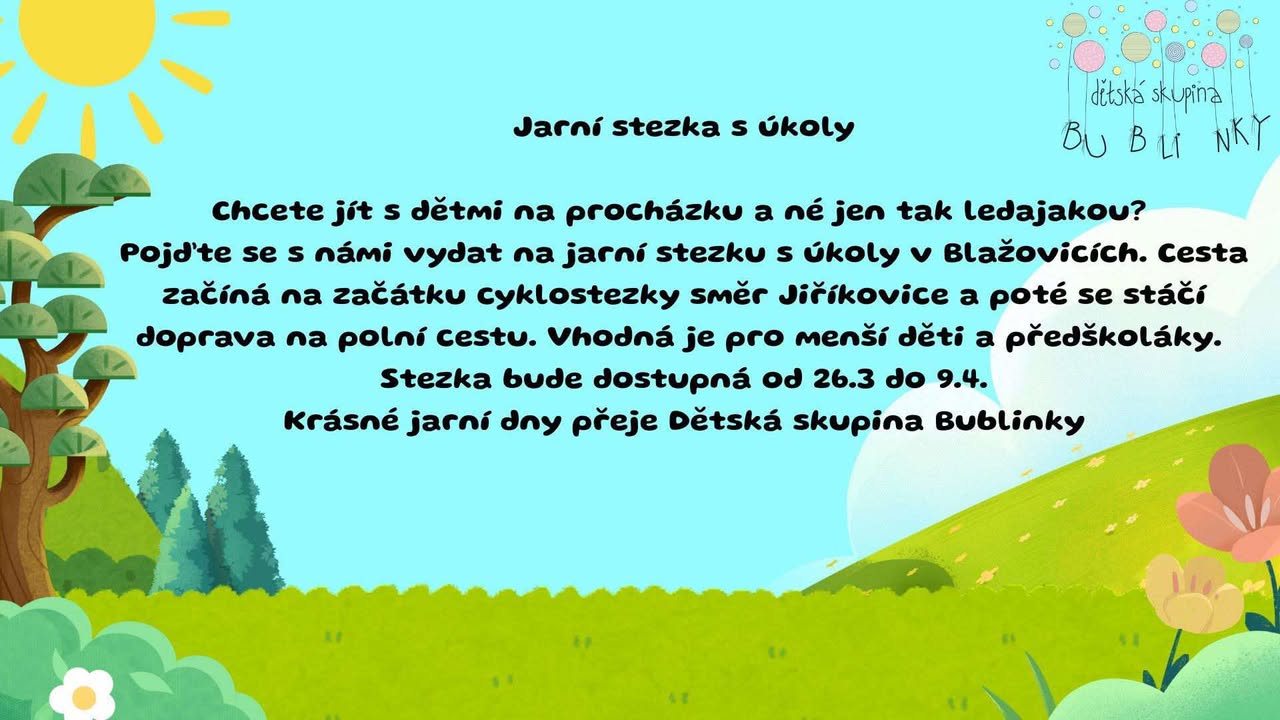 Dětská skupina Bublinky Blažovice zve manší děti a předškoláky na Velikonoční stezku s úkoly v Blažovicích.