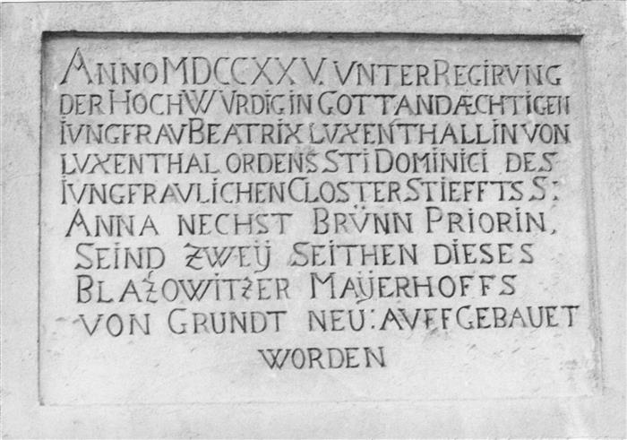 Druhá deska, o 118 roků mladší, umístěná na „šafářském“ traktu zámečku směrem do návsi, dává německým textem vědět, že roku 1725 za veledůstojné a bohabojné panny Beatrix Luxenthalové z Luxenthalu, převory svatoanenského kláštera, byly dvě strany tohoto dvora z gruntu nově vystavěny.