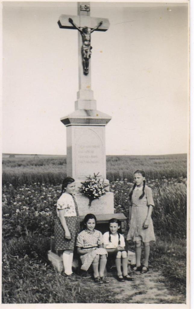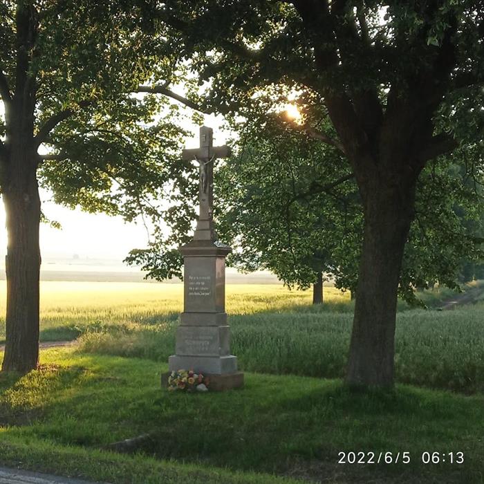 Kříž byl postaven v roce 1928 na paměť Cyrila a Františky Tužínových. Manželé Cyril Tužín a Františka (dcera Antonína Bočka z čísla 73) neměli děti a odkázali domek č. 3 synovci Cyrilu Tužínovi, který neměl polnosti ani jiný majetek. Jejich synovec Cyril Tužín nechal z vděčnosti postavit tento kříž.