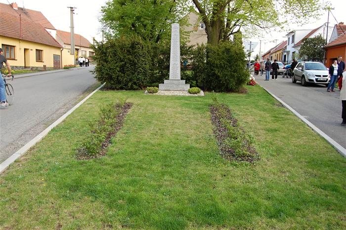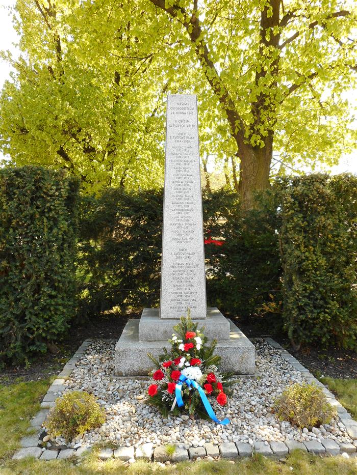 Našim osvoboditelům 24. dubna 1945 a obětem světových válek. Dále jsou zde vytesána jména obětí 1. i 2. světové války.